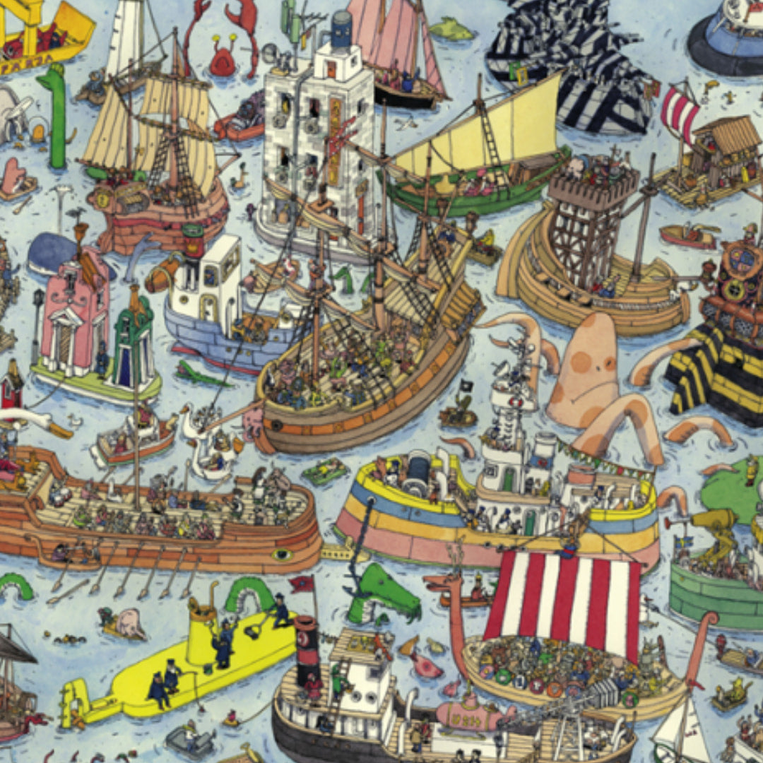 The paddle steamboat is a long way from home, the tall ships are hungry for battle and the spy ship is not very well disguised. The 1500 piece jigsaw puzzle Regatta is one of those that makes you wonder how on earth does someone come up with such an idea. You can’t help but be amazed at the creativity of the artist - the attention to detail is clear to see. Just watch out for the huge octopus, giant crab and fierce lobster!