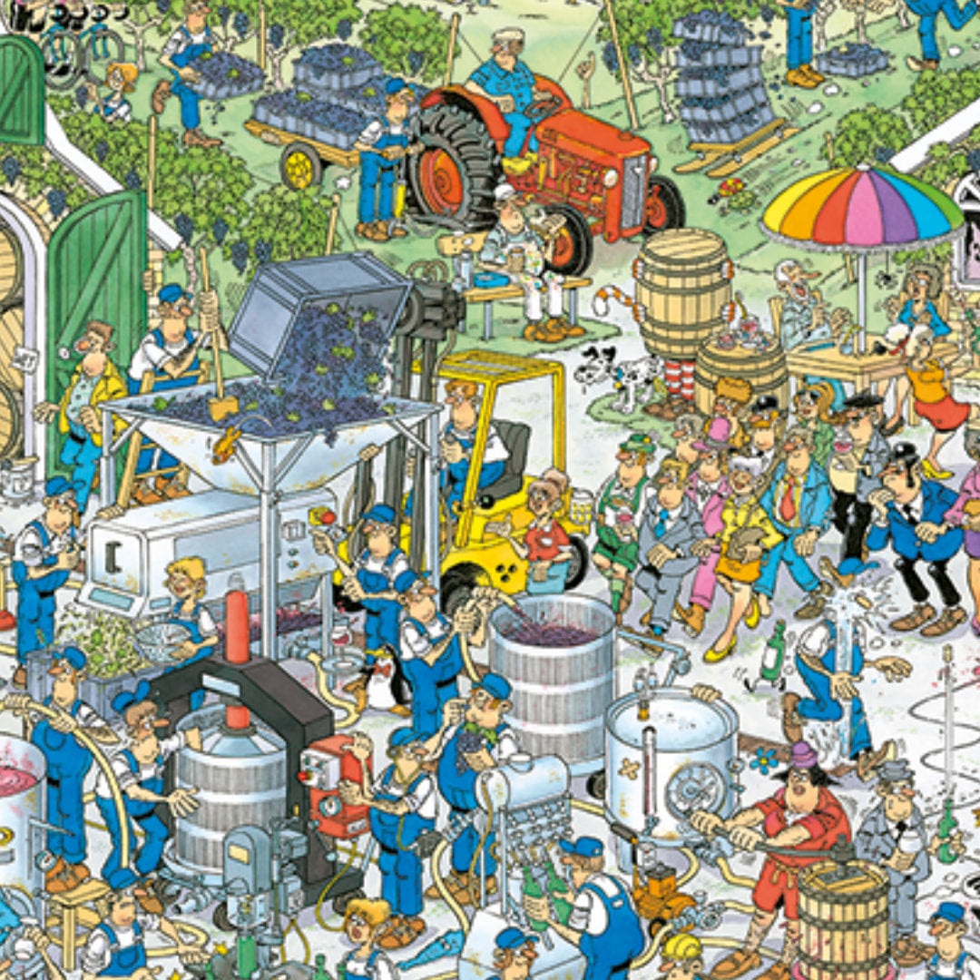 A Jan van Haasteren puzzle is so much more than just a puzzle - it’s an adventure series with familiar characters playing the lead roles in a never-ending decor full of absurd details. Discover the crazy adventures of the workers...and grape crushers in The Winery 3000 piece jigsaw puzzle.
